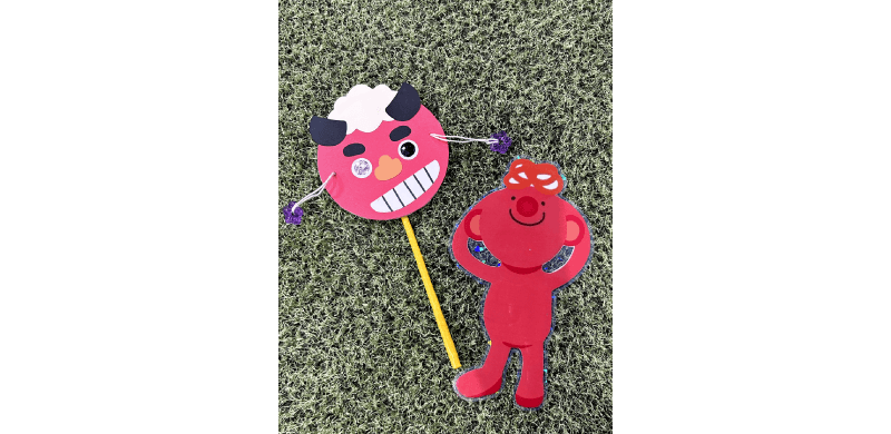 - ★ししまいのでんでん太鼓を製作します。福笑いのように顔のパーツを貼ったら完成です!