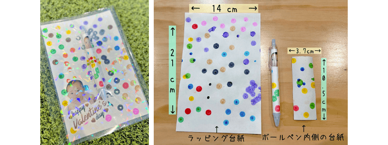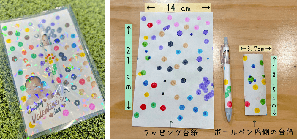 ドットマーカーで模様を付けたり、お写真を貼った台紙をボールペンの中にセットしたら、完成です。