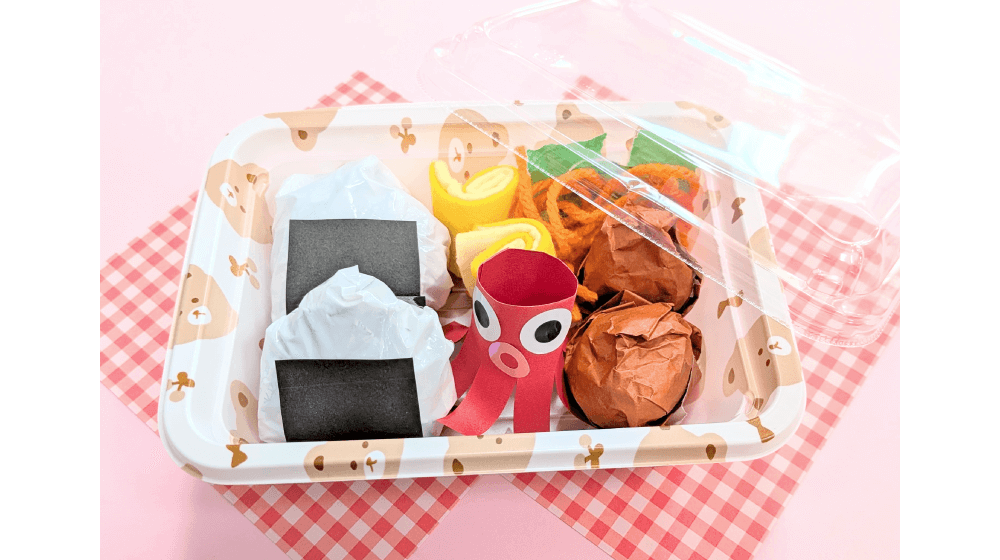 ★フェルトでできた卵焼き、画用紙でできたタコさんウインナー、カラーポリ袋でできたおにぎり等々、可愛いお弁当箱に詰めてできあがりです♡